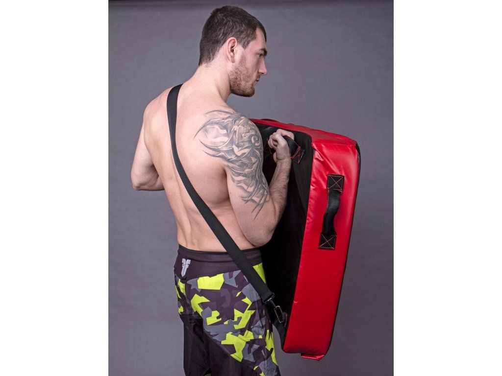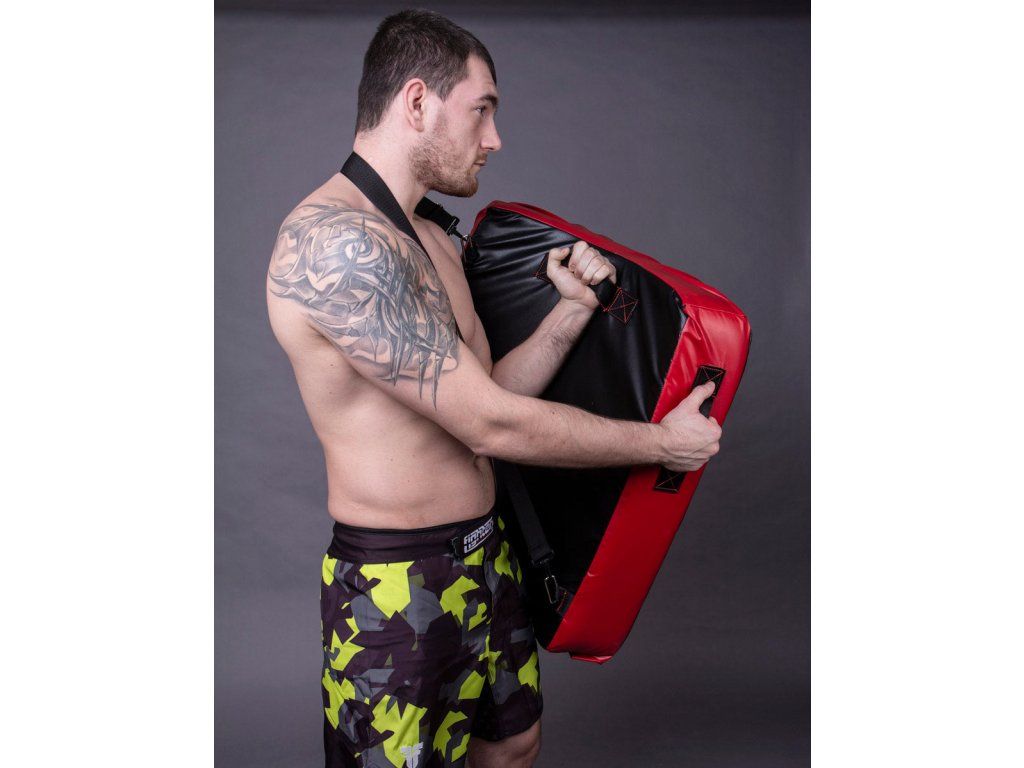 Tréninkový štít Fighter. Tento štít od firmy Fighter je vybaven třemi úchyty a pro větší variabilitu tréninku je přidán popruh, který se nachází na zadní části štítu. Díky němu se štít také dá nasadit přes rameno. Štít je prohnutý a v jeho středu je přidána extra výplň pro větší bezpečnost. Plášť lapy je vyroben z tvrzeného vinylu, který zajištuje dlouhou živostnost. Výplň tvoří speciální molitanová směs, lapa tedy skvěle pohlcuje i ty nejsilnější údery. Díky univerzálnosti je blok vhodný pro většinu bojových sportů. všechny použité materiály jsou z EU vysoká životnost výrobku vyrobeno v České republice snadno omyvatelný Váha štítu je 4.5 kgDoplňkové parametry