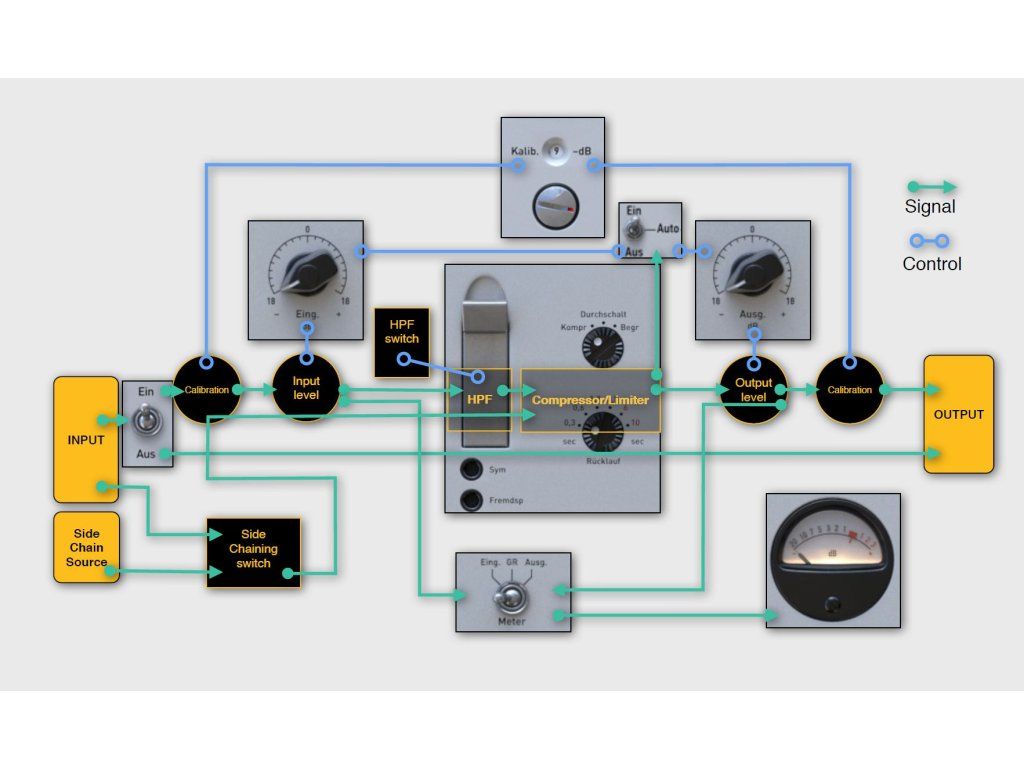 Horní potenciometr U73b přepíná mezi módem komprese (Kompr), bypassu (Durchshalt) a limiteru (Begr). Mód kompresoru má nižší threshold a velmi jemně se zvyšující kompresní poměr. Naproti tomu limiter má vyšší threshold s vyšším kompresním poměrem, ale stále velmi jemný parametr „knee“.