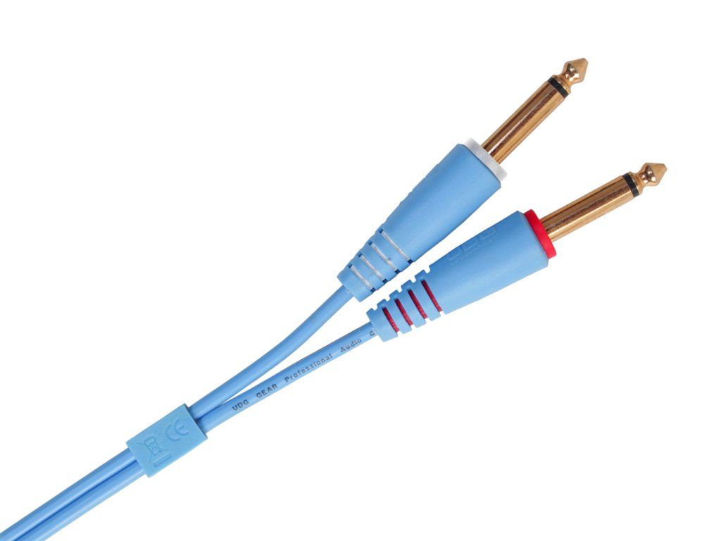 Dvojitý audio kabel s konektory TS 6,3 mm (velký jack) k propojení DJ, profesionálních i komerčních přístrojů, zlacené kontakty konektorů, kvalitní stínění, mechanická odolnost, barva modrá